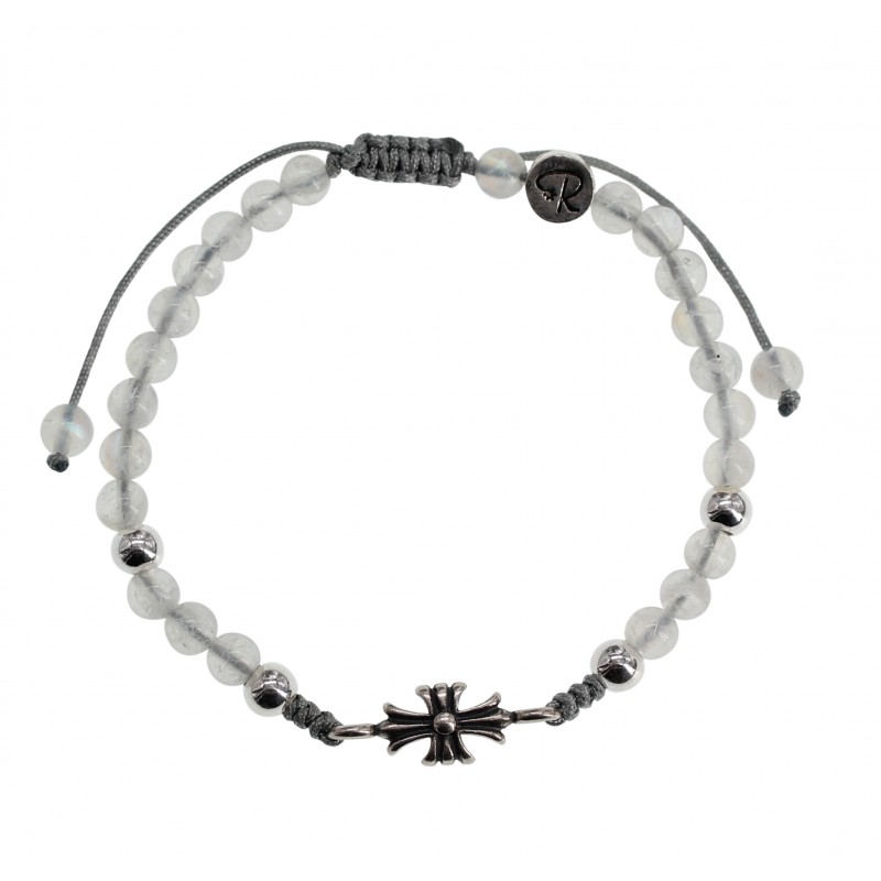 Ce bracelet est composé d'une Croix en Argent et de perles rondes de pierre. la pierre est à choisir entre : Oeil de tigre, Pierre de Lune, Jaspe Dalmatien, Cornaline et Pyrite.
