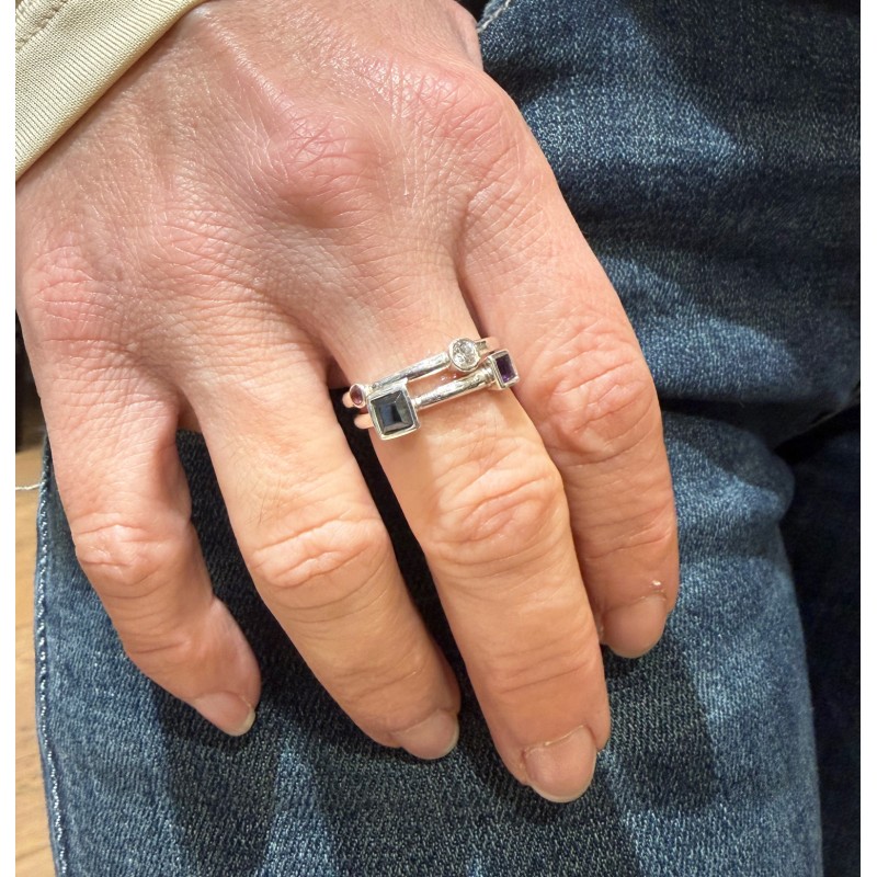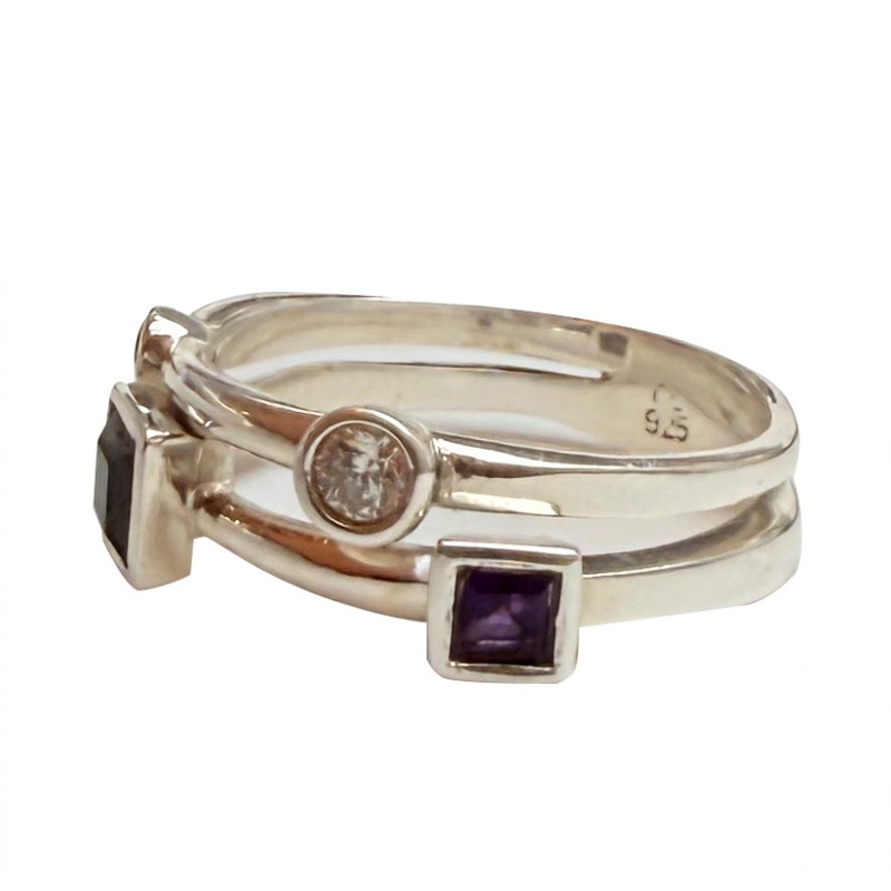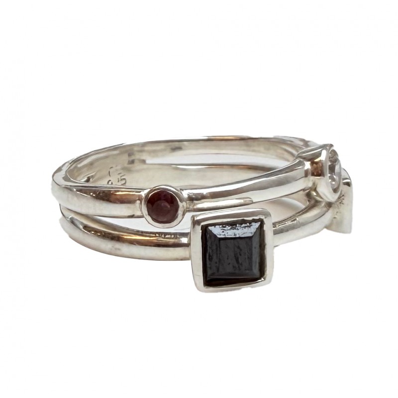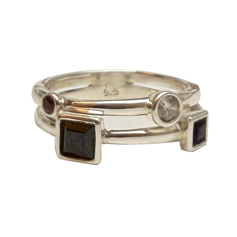 Bague en argent 925 ornée de quatre pierres naturelles : Onyx, Grenat, Améthyste et Zirconium. Un bijou élégant aux couleurs vibrantes, idéal pour apporter énergie et sophistication à votre style. Conception soignée et finition brillante.