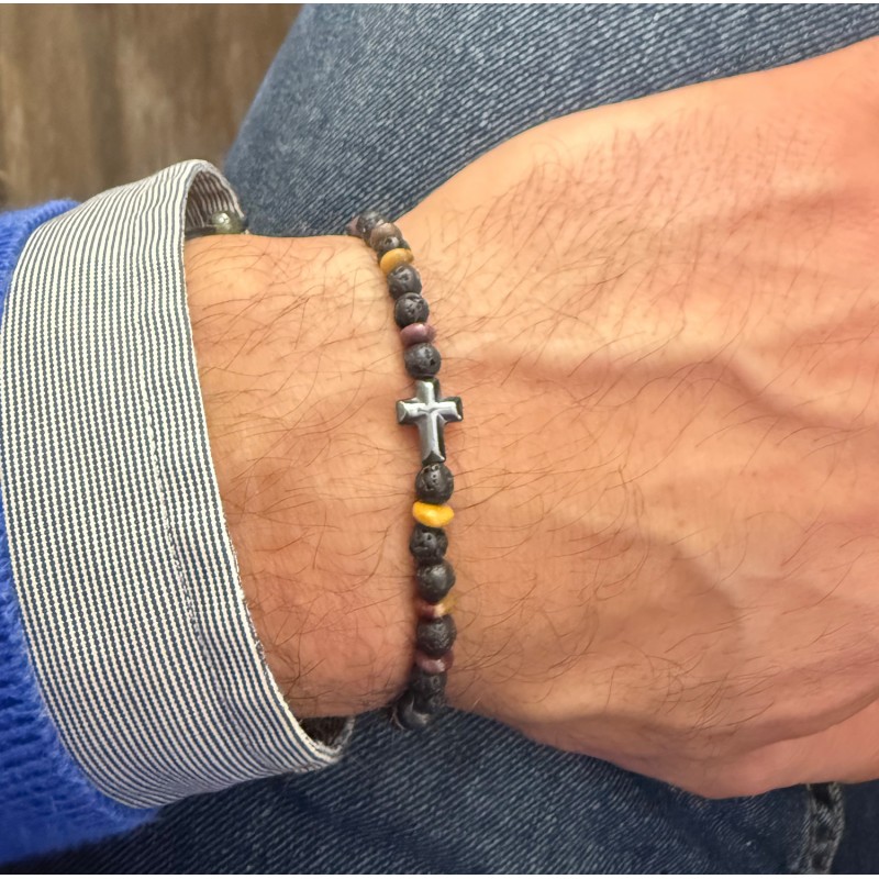 La croix en hématite gris anthracite renforce la dimension spirituelle et protectrice du bijou, tout en ajoutant une note graphique très masculine. Monté sur un cordon noir résistant avec nœud coulissant, le bracelet s’ajuste facilement à la plupart des poignets pour un port confortable au quotidien.