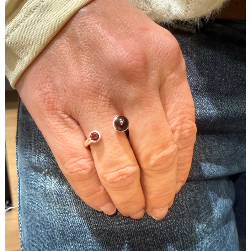 Bague Gemini en argent 925, fine et moderne, ornée de deux labradorites : une demi-sphère et une pierre facettée. Modèle ouvert et élégant, idéal au quotidien. Labradorite certifiée pour une qualité optimale.
