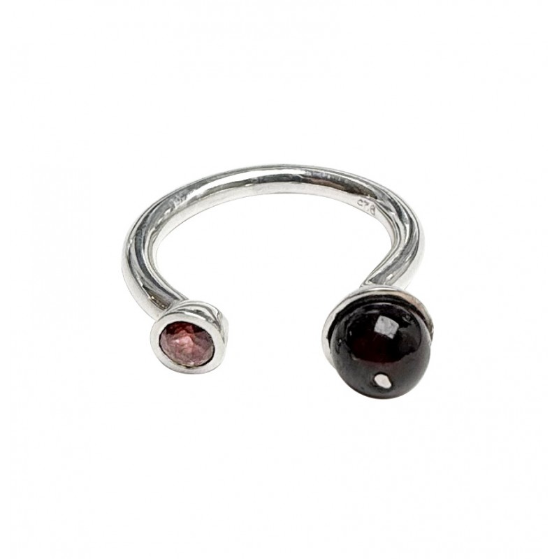 La Bague Gemini en Labradorite allie modernité et élégance dans un design ouvert en argent 925. Chaque pièce est ornée de deux labradorites : une demi-sphère lisse et une pierre facettée, créant un duo harmonieux qui capte la lumière sous différents angles.