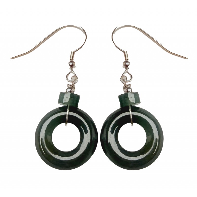 Boucles d'oreilles Grâce Circulaire en jade vert naturel, forme anneau épuré, montées sur crochets argent 925. Un bijou de géométrie pure, élégant et apaisant, pour un style intemporel et sophistiqué.