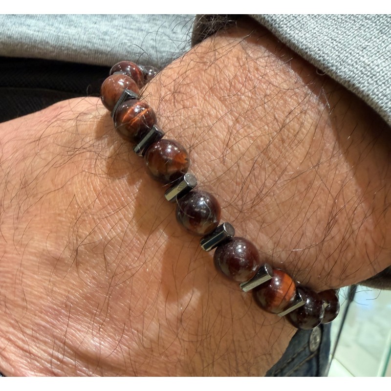Les perles rondes, d’un brun rouge profond aux reflets chaleureux, sont rythmées par de petits tubes et des rondelles en hématite gris acier, qui apportent une touche graphique et contemporaine. Le tout est monté sur un cordon noir résistant, ajustable grâce à un nœud coulissant, pour s’adapter facilement à la plupart des poignets tout en garantissant un excellent confort de port.