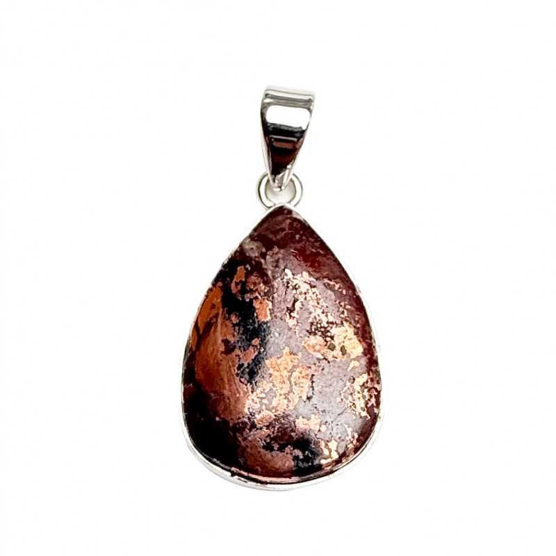 Pendentif en pierre de cuivre, serti clos en argent 925. Un bijou unique qui allie la chaleur du cuivre et la finesse de l’argent, pour un rendu élégant et durable.
