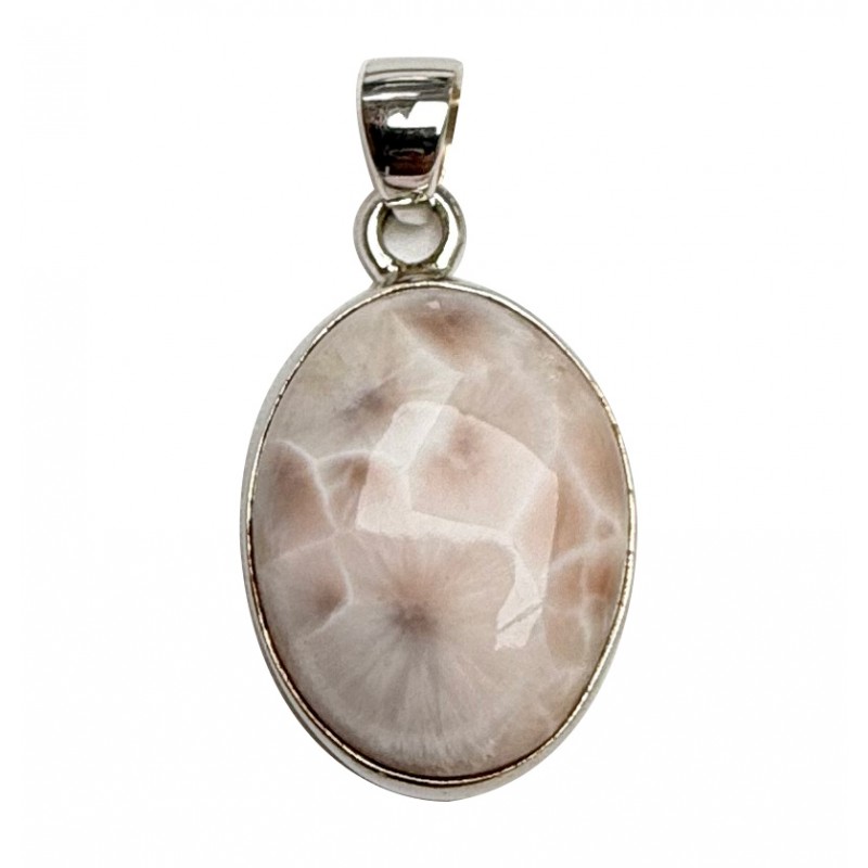Pendentif en thomsonite naturelle, serti clos en argent 925. Un bijou rare et élégant, qui allie énergie positive et raffinement artisanal, parfait pour un style unique et authentique.